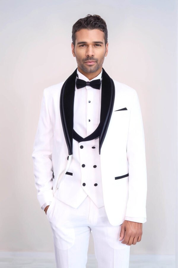 3 Piece Trim Detailed Self-Patterned Velvet Shawl Collar White Men’s Tuxedo