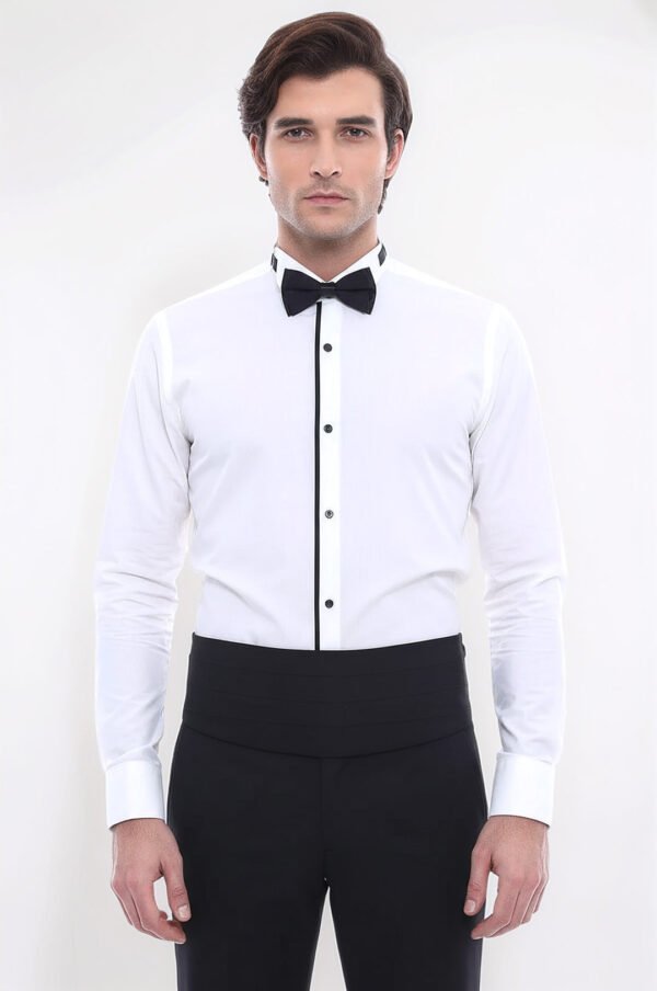 This long sleeve men’s groom shirt model is a simple and stylish model. This slim-fit and slim fit shirt fits your body so you can look better. The black bias detail on the front buttons add color by animating the shirt. Cuffed sleeves make you look more stylish. Completely cotton fabric allows you to sweat the least night. With this shirt model, you can look stylish and move comfortably.