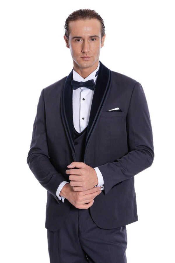 This navy blue tuxedo from Binye features a detachable velvet lapel, giving you the option to switch up your look and add some luxury to your formal attire. Perfect for any special occasion, this tuxedo offers a touch of elegance and versatility. Expertly crafted with high-quality materials for a refined and polished appearance.