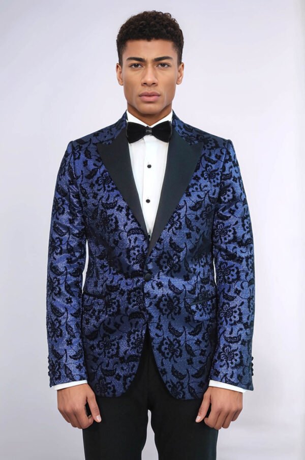 Floral Patterned Peak Lapel Navy Blue Men Prom Blazer