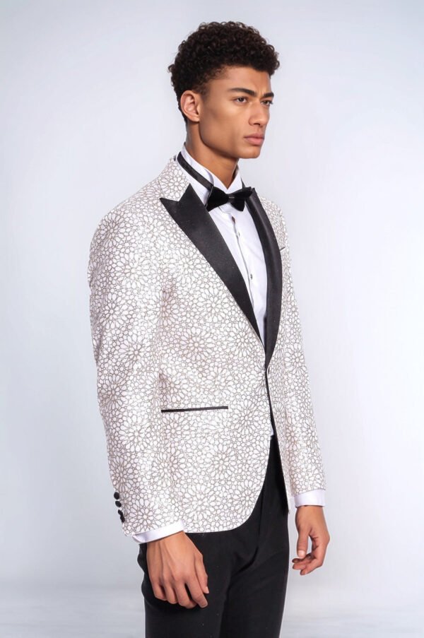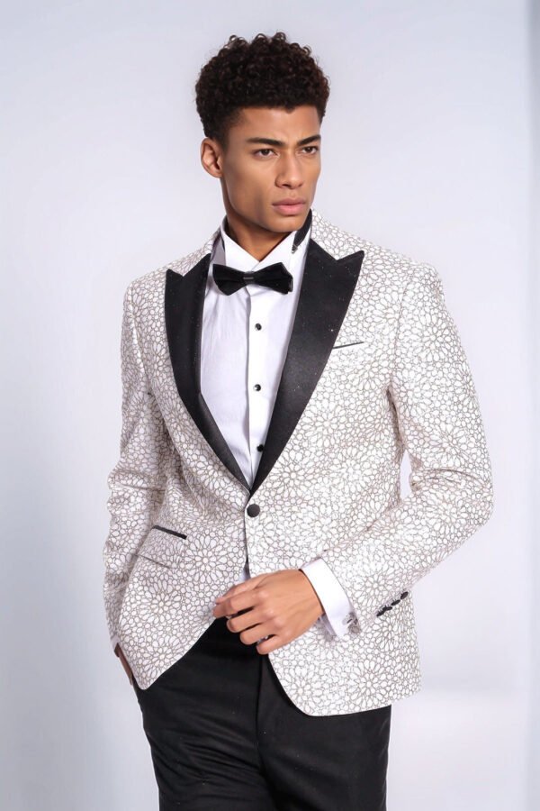 Tuxedo jackets are the key to displaying a noble and elegant stance in menswear. Glittery and patterned jackets make you look impressive when worn on special occasions or invitations. These special jackets add a sophisticated touch to your style, allowing you to move away from the ordinary. If you want to be the star of the night, you should definitely have a tuxedo jacket in your wardrobe. This embroidered floral patterned white men’s tuxedo jacket combines your elegance with the innocence of white. With its slim fit cut, it perfectly fits your body lines and offers a modern silhouette. It is designed to maximize your elegance on special occasions, invitations, parties and graduation ceremonies. You can combine your white embroidered floral print tuxedo jacket with a white shirt and black slim fit pants for a classic elegance. You can have a sophisticated style by completing your outfit with black oxford shoes and a black bow tie.