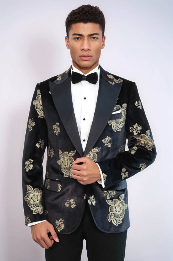 Gold Floral Patterned Shiny Black Men Prom Blazer
