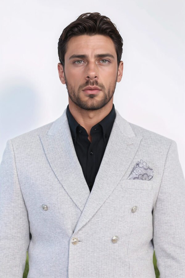 This gray pinstriped blazer is the perfect balance between classic tailoring and contemporary sophistication. Designed in a slim fit cut, it follows the body’s natural lines to offer a clean and confident silhouette. The double-breasted front is accented with silver-tone metal buttons, adding a sharp and refined touch to the soft gray fabric with subtle vertical stripes.