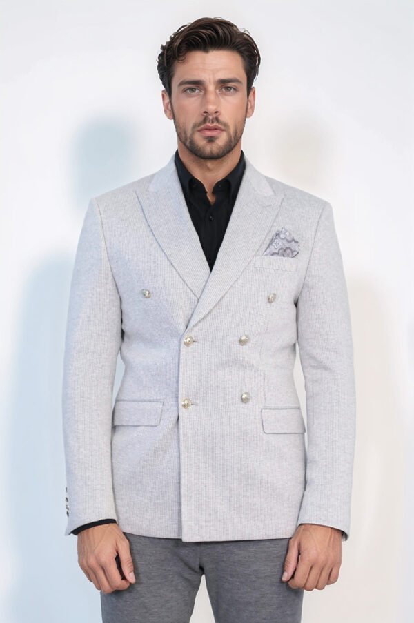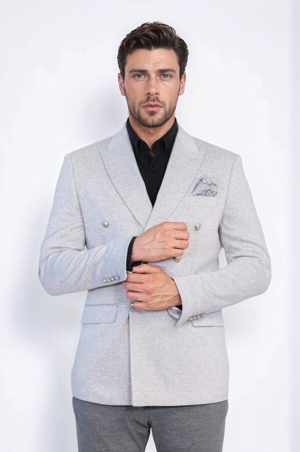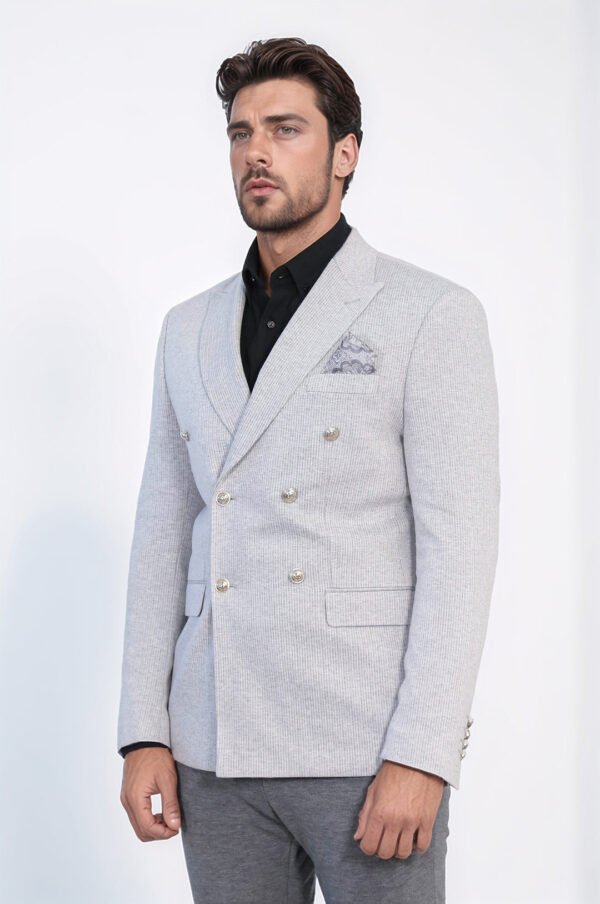 Grey Pinstriped Slim Fit Double-Breasted Blazer with Silver Metal Buttons