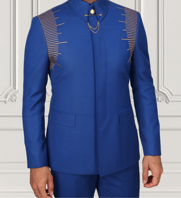 This Blue embellished safari suit from Binye Store is crafted for men who want a refined look with a bold edge. Designed for high-profile events, weddings, receptions, and special occasions, it combines classic tailoring with striking decorative detail.
