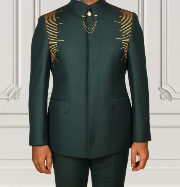 This Green embellished safari suit from Binye Store is crafted for men who want a refined look with a bold edge. Designed for high-profile events, weddings, receptions, and special occasions, it combines classic tailoring with striking decorative detail.