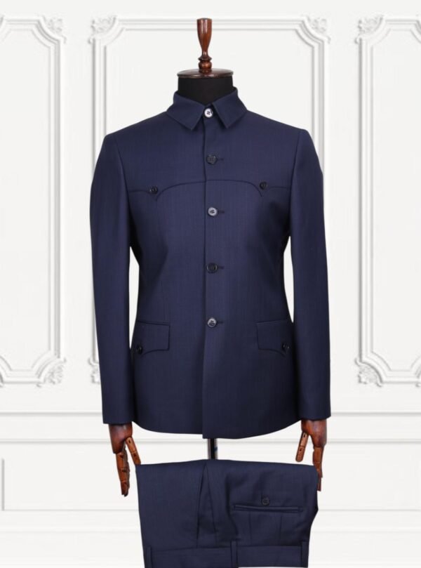 This Royal Blue Safari Suit captures timeless elegance with a contemporary edge. The curved chest detailing and clean front design add architectural precision, while the structured shoulders enhance posture and presence. Its vibrant yet dignified hue sets you apart without overpowering your overall look. Whether styled with polished black leather shoes for a formal event or elevated with statement accessories for a luxury celebration, this suit guarantees distinction. Designed for men who lead with confidence, it delivers both comfort and commanding style in equal measure.