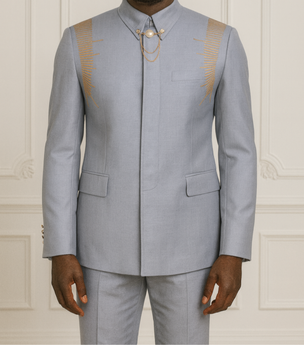 This grey embellished safari suit from Binye Store is crafted for men who want a refined look with a bold edge. Designed for high-profile events, weddings, receptions, and special occasions, it combines classic tailoring with striking decorative detail.