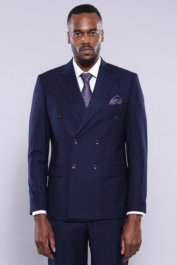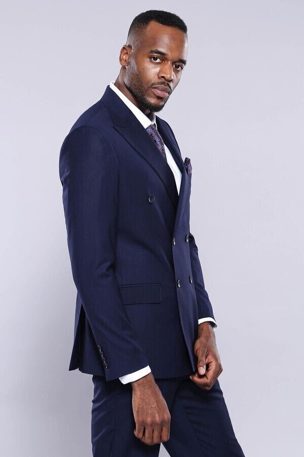 Introducing the Navy Blue Fitted Suit, the ultimate statement piece for the modern gentleman’s wardrobe, designed to exude confidence and sophistication. Crafted with premium materials, this double‑breasted suit combines durability and elegance, ensuring you look sharp and polished at every formal occasion.