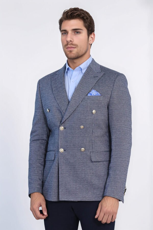 Navy Pinstriped Slim Fit Double-Breasted Blazer with Silver Metal Buttons