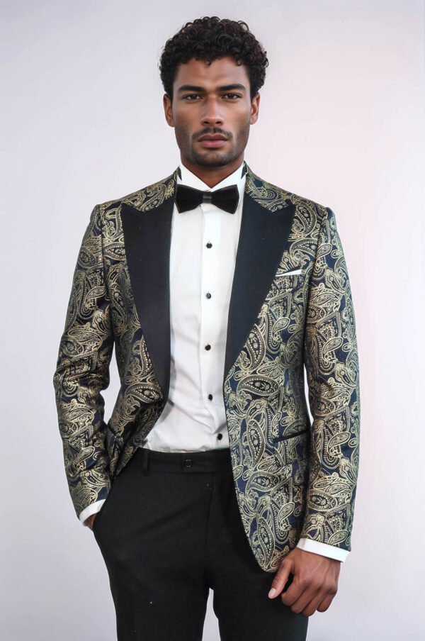 Elevate your formalwear collection with our slim fit, paisley pattern, navy blue, single-button men’s prom blazer. It’s time to showcase your impeccable style and make a lasting impression at any event or occasion. Crafted with precision and attention to detail, this navy blue blazer combines a slim fit with a timeless paisley pattern, exuding sophistication and charm. Designed to enhance your physique, the slim fit of this blazer accentuates your silhouette, providing a modern and tailored look that is sure to turn heads. Whether you’re attending a formal event or a special occasion, this blazer ensures you’ll make a confident statement. The distinguished paisley pattern adds an element of refinement to your ensemble, offering a touch of elegance and individuality. Its intricate motifs and flowing lines create a captivating visual appeal, setting you apart from the crowd and showcasing your impeccable taste. Featuring a single button closure, this blazer exudes a sleek and polished aesthetic. The single button adds a modern twist while maintaining a timeless appeal, ensuring you achieve a sophisticated and put-together look. Pair this slim fit blazer with tailored trousers and a crisp white shirt for a classic and sophisticated ensemble. Complete the look with polished leather shoes and a matching pocket square. Remember, confidence is key when wearing this blazer. Embrace your personal style, experiment with different combinations, and make a statement that reflects your individuality.