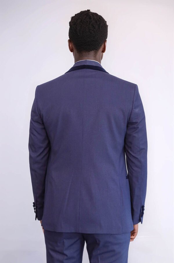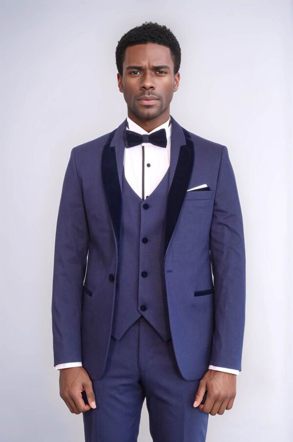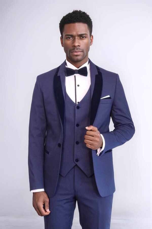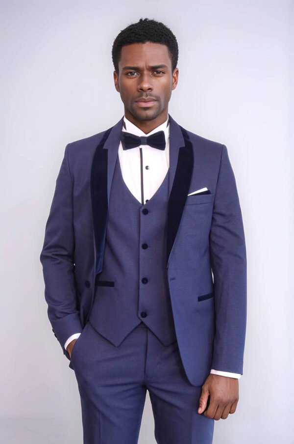 Expertly crafted with a luxurious patterned velvet lapel, this navy blue tuxedo from Binye exudes sophistication and elegance. The perfect choice for formal occasions, this tuxedo offers a timeless style that will elevate any ensemble. Experience ultimate comfort and style with Binye.