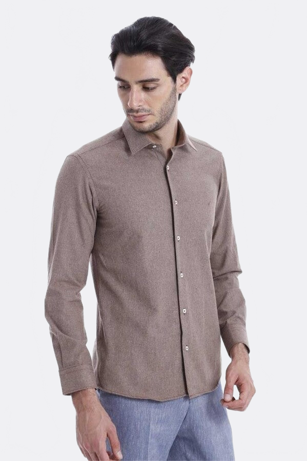 This shirt, which looks very stylish and aesthetic with its special dobby structure, will warm you in cold winter days with its woolen structure. You will reveal the harmony of the brown tones with the winter months and you will show the nobility within you with this product. You will feel the charm of this product, which does not tire with its plain structure, from the first moment you start wearing it. You can combine it with a sports jacket with jeans and linen fabric to wear it in your daily or business life and have a stylish look.
