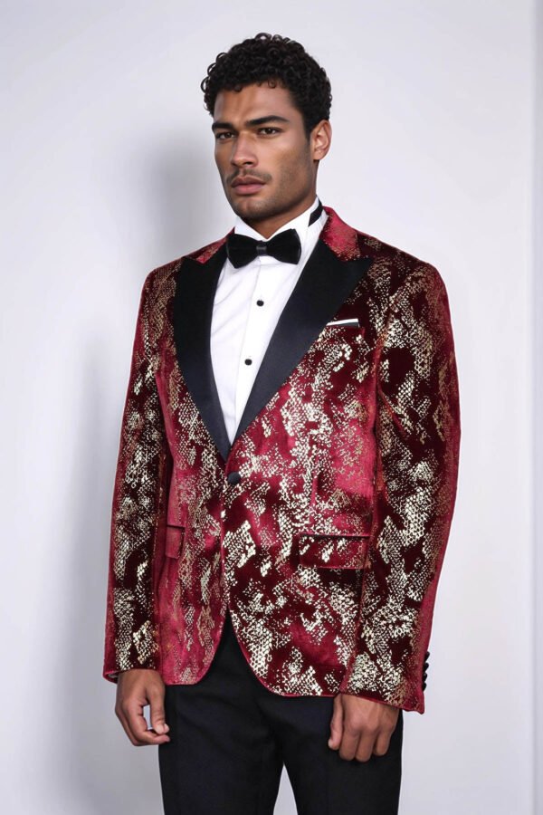 Peak Lapel Slim Fit Gold Patterned Burgundy Men Prom Blazer