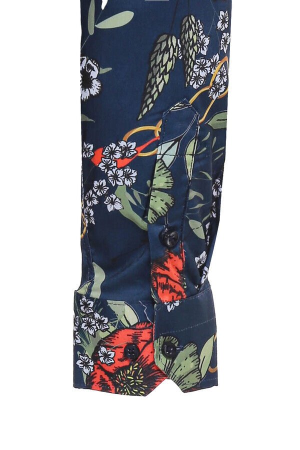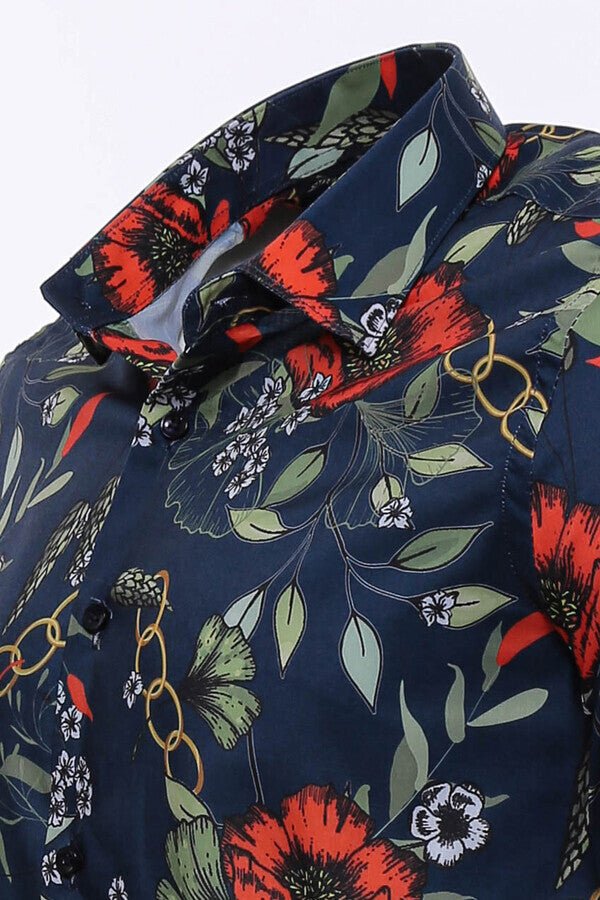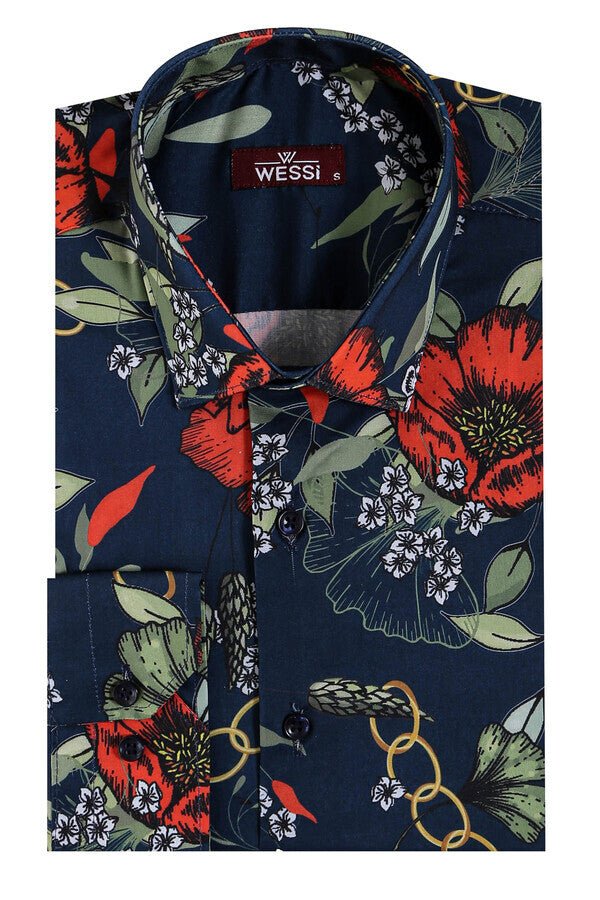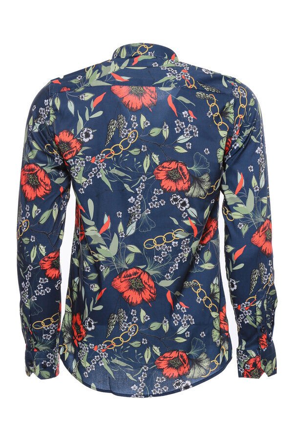 Red Floral Patterned Slim-Fit Long Sleeves Navy Blue Shirt