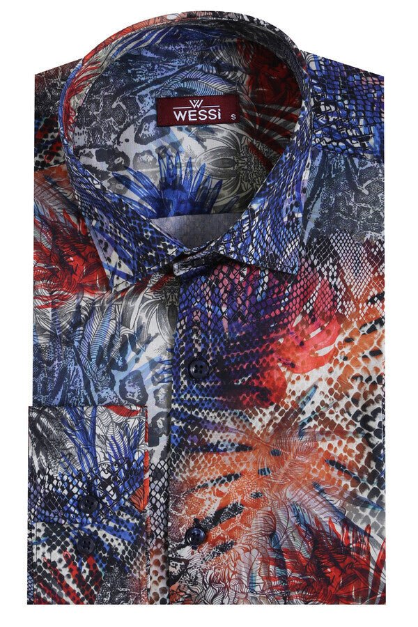 If you’re looking to add a pop of color to your wardrobe, this slim fit, long sleeves, red leaf patterned navy blue men’s shirt is the perfect addition. Not only does this shirt offer a unique and eye-catching design, but it also fits snugly for a sleek and sophisticated look. First off, pair this shirt with dark denim jeans or black slacks for a classic and polished look. Add some brown leather shoes or white sneakers to complement the navy blue base of the shirt. For colder weather, layer a black or grey sweater over the top and finish off with a wool coat in either navy blue or camel. If you want to go for a more casual vibe, wear this shirt with white chinos or khaki shorts during summer months.