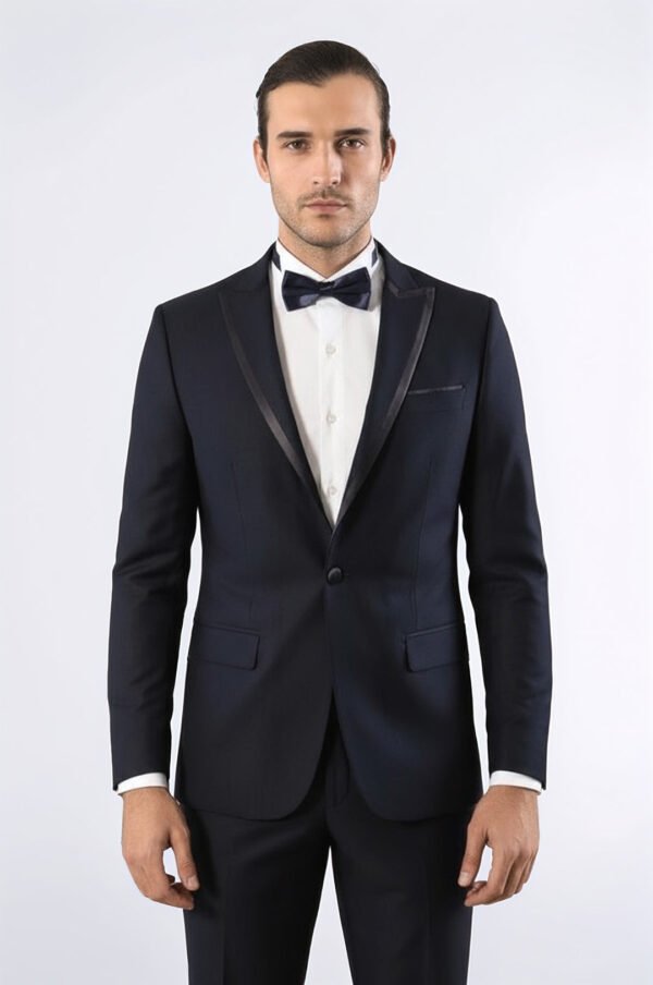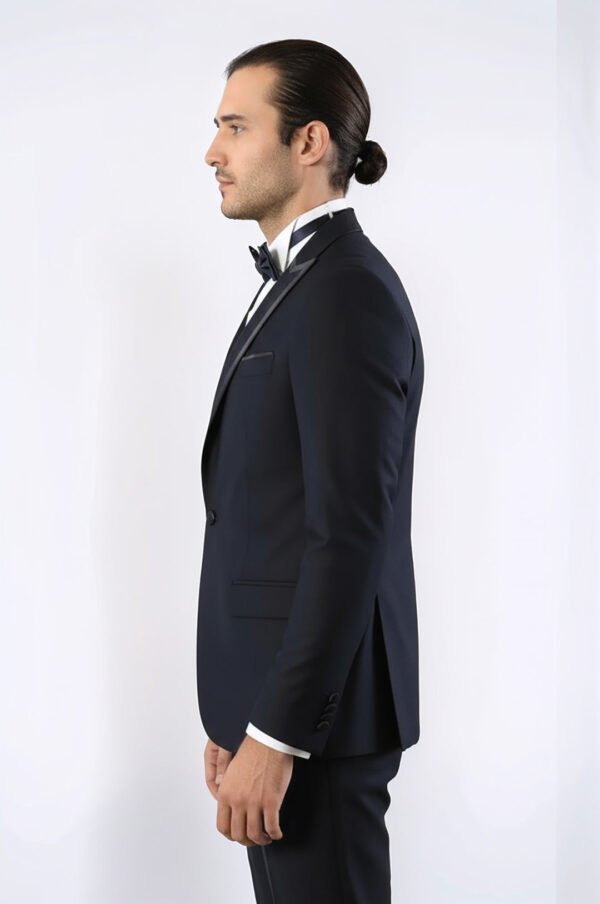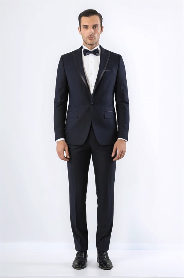 This suit, which is one of the modern groom suit models, consists of two pieces. It offers a stylish and beautiful appearance. Patternless navy blue jacket forms the first piece. Featuring a removable shawl collar, this jacket model has two satin straps on the collar. This jacket, which has a double button, has three pockets. The navy blue, comfortable-cut trousers form the second piece of the suit. The jacket and trousers made of slim fit mold will wrap your body.