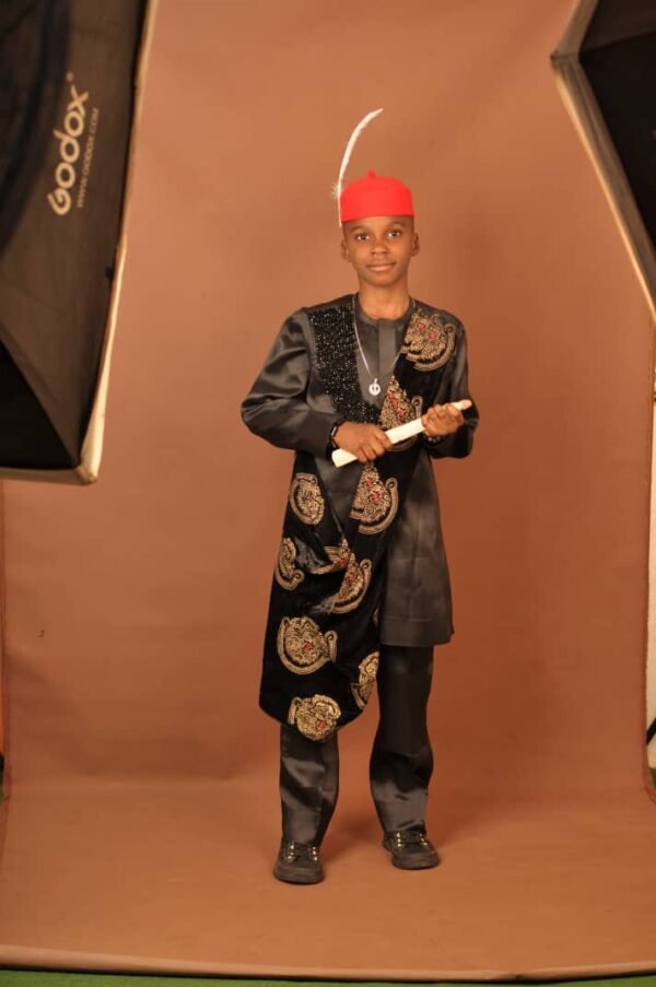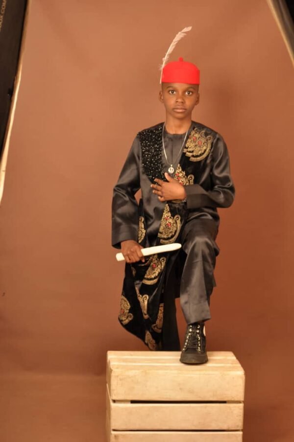 Designed as a complete statement piece, this set is suitable for boys and men alike, making it ideal for family ceremonies, cultural celebrations, weddings, chieftaincy events, photoshoots, and special occasions. The timeless black palette allows versatility while maintaining a regal and commanding appearance.