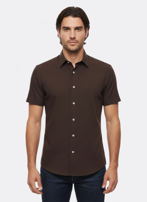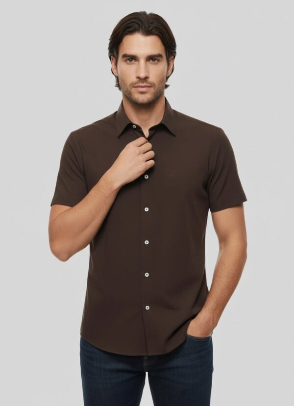 Looking for a versatile and stylish addition to your wardrobe? Look no further than our slim fit, short-sleeved, plain brown men’s shirt! This classic piece is perfect for any occasion, whether you’re dressing up for a night out or keeping it casual for a day in the office. To complete your look, we recommend pairing this shirt with a grey jeans and some sleek brown loafers. For a more formal event, add a black blazer to elevate your outfit even further. With its slim fit cut and short sleeves, it’s both comfortable and flattering, ensuring that you’ll look and feel your best no matter where you go. So whether you’re heading to a business meeting, a date, or just out with friends, our slim fit, short-sleeved, plain brown men’s shirt is the perfect choice to keep you looking stylish and put-together.