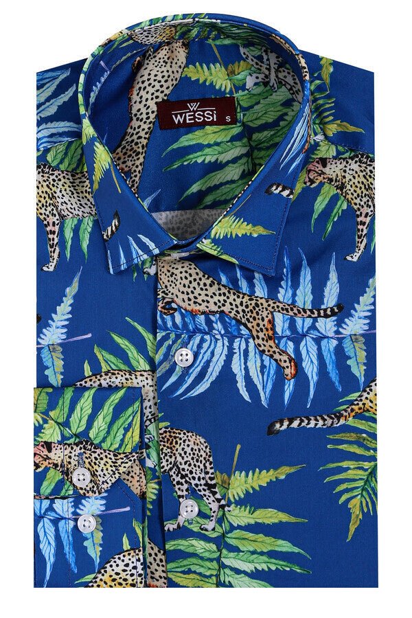 Add fun and vibrancy to your style with the slim-fit long-sleeved blue men’s shirt featuring a vibrant style with tiger and leaf patterns. This shirt is both stylish and seasonal with its slim-fit cut and cotton construction. The long sleeve design provides extra protection. Thanks to its cotton structure, this shirt is a suitable option for seasonal use. Breathable and lightweight, it provides comfort in hot weather and complements your style. The blue color adds freshness and energy to the shirt. Tiger and leaf patterns add visual appeal and originality to the shirt. It is one of the prominent pieces of the wardrobe for men who want to reflect their style. You can easily wear this shirt in daily life. It is ideal for looking energetic and stylish in daily activities such as meeting friends, shopping trips or city tours. For example, you can combine this shirt with white or cream chino pants for a stylish and casual look. For shoes, you can choose white sneakers.
