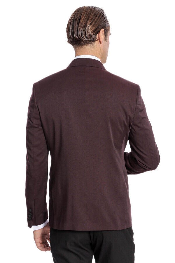 The marvelous harmony of burgundy and black will reflect your style. The black shiny fabric collar jacket is integrated with the trousers.