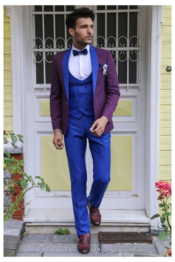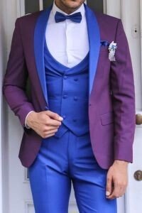 The groom of your dreams is at Binye! A charming blue pants with the most vital shade of blue combined with a waist-fitting burgundy jacket with three rows of buttons on the top and a blue breasted vest! You can combine this three-piece grooming model with the most noble way of combining blue and bordering with a white shirt and increase your elegance. With this grooming model, you will be dazzled and look very impressive on the most important day of your life!