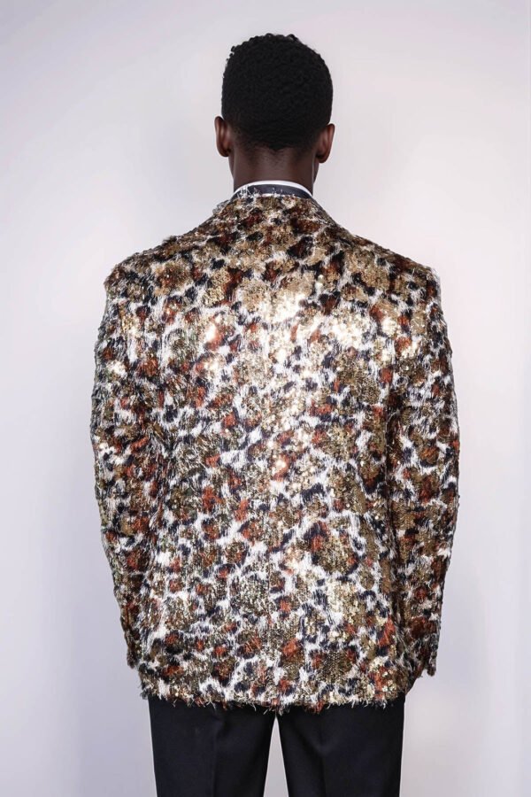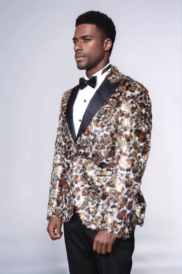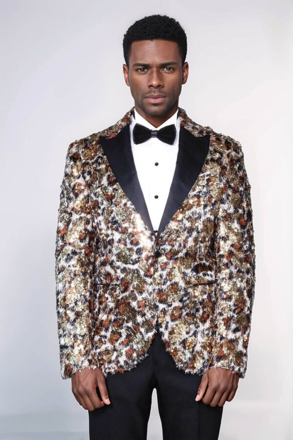 This White and Gold Feather Patterned Men’s Prom Jacket – Binye exudes elegance and style. Made with high-quality materials, its intricate feather pattern adds a unique touch. Perfect for formal events, this jacket will make you stand out while providing comfort and sophistication. Elevate your look with Binye.